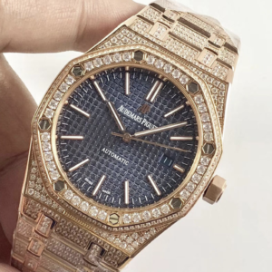 Audemars piguet replica royal oak 41mm rose gold full paved diamonds blue dial